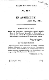 Communication from the Governor, transmitting certain resolutions of the General Assembly of Maryland, relative to the power of Congress to interfere with the domestic institutions of the several states.