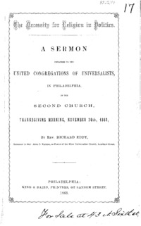 - The necessity for religion in politics : a sermon preached to the united congregations of Universalists, in Philadelphia, in the Second Church, Thanksgiving morning, November 26th, 1863,
