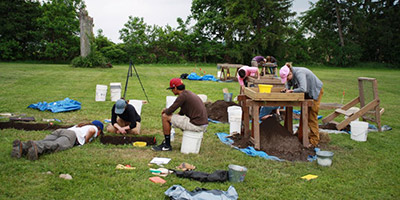 Test excavations in 2014 in the West Lawn area of the White Springs site revealed a row of small posts that greatly resembled a wall from a Haudenosaunee house. Archaeologists tried to chase out this line of posts, eventually finding that the posts formed an arc. This could only mean that we had found the very end of an Onöndowa'ga:' house, and we also knew that it extended east from this arc of posts. In 2015, archaeologists opened up a larger excavation trench to get more information about the house.